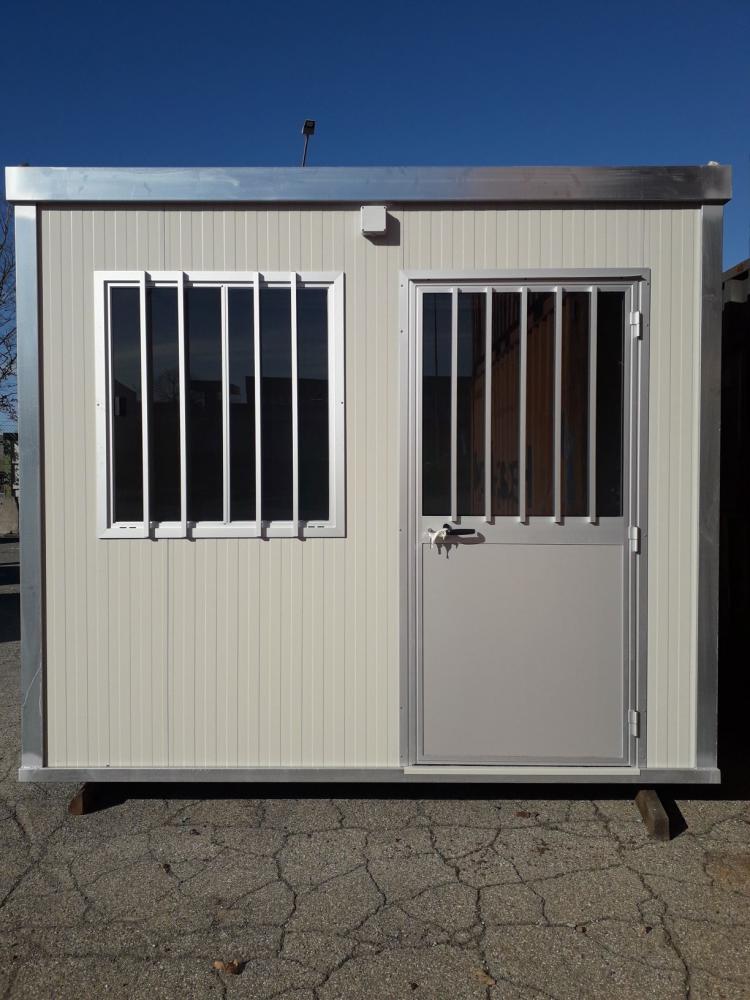 Pareti e copertura in pannelli sandwich spessore 30+40, serramenti preverniciati di colore bianco, barre di protezione, staffe di sollevamento e profili zincati.